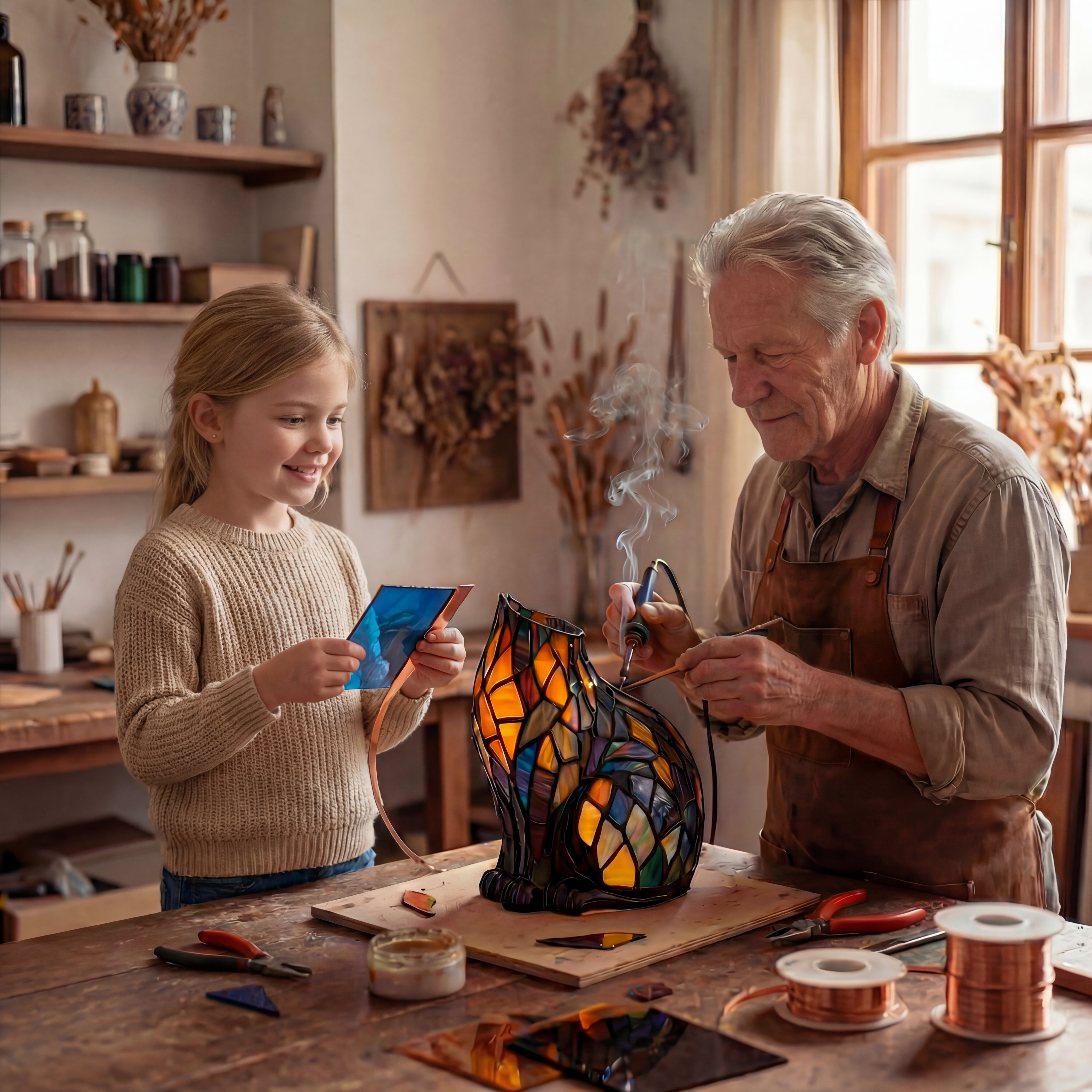 Crafted from fine stained glass and shaped by hand, our lamps bring the character and glow of timeless artistry into your home, no gallery ticket required.